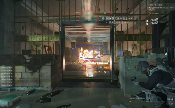 银行总部副本开始没多久,就回来到一个带有铁闸的保险库通道,在走廊的尽头是一道圆形的大闸门(如图),之前会有一波敌人,数量大概在7-8人左右,会集中在最后的房间出来,唯一的出口就是这波怪就是我们的目标。刷完后只要手雷或喷火器自杀即可立刻在弹药箱位置重生,下面就不重复描述了。