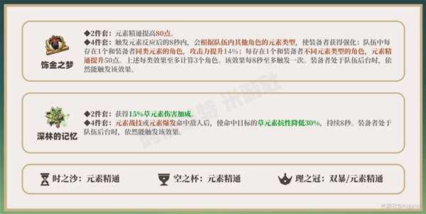 ①.当草神作为输出角色时可优先使用饰金4,辅助其他草元素角色时可选择草套4(更多是是饰金套考虑双暴头冠、草套为三精通的搭配)。