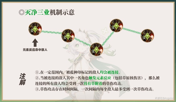 ①.战技施放时不产生元素微粒,灭净三业攻击命中敌人将产生3颗草元素微粒,冷却时间7秒。