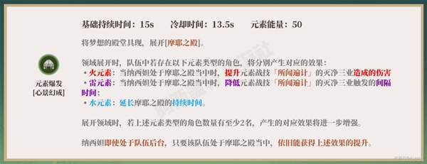 ①.纳西妲的元素爆发是一种增益类技能,本身没有伤害,开启大招后会根据队伍中的火/雷/水元素角色的数量产生不同效果(如上技能图)。