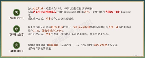 ①.该天赋对场上队友提供的精通是锁数值的,将以纳西妲开大瞬间队伍中的最高非额外元素精通为依据,直到大招持续时间结束。