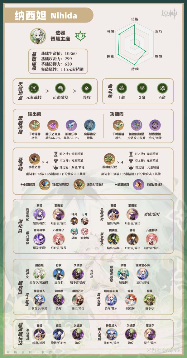 本篇的主旨是讲解纳西妲的机制、养成方面,对于配队会给出一个较为全面的总览方向,后续会出一个专题来专门讲解更为详细的队伍搭配内容~