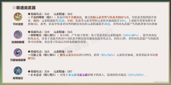 ①.当元素精通高于900时可以考虑双暴类武器,否则优先选择精通类武器。
