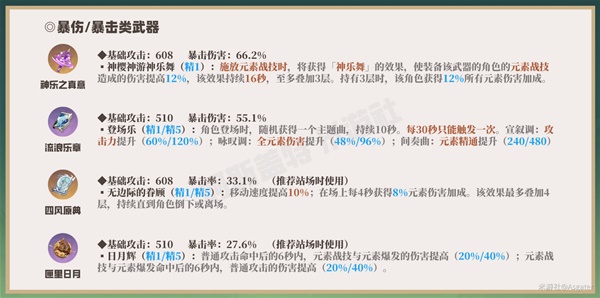 ②.站场玩法时可以优先选择神乐之真意(5)、四风原典(5)、匣里日月(4)、万国诸海图谱(4)等武器。