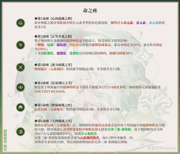 纳西妲在高命座时将进一步提升其辅助效果、爆发输出能力。(培养简图如下)