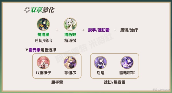 纳西妲的战技间隔着在双雷时会得到最大的缩短,当搭配水元素、雷元素角色时可以配合高频雷元素角色在产生原激化反应的同时激元素也会与水元素产生绽放反应,而雷元素角色与草原核可进一步触发超绽放反应,以达到补充伤害的目的。