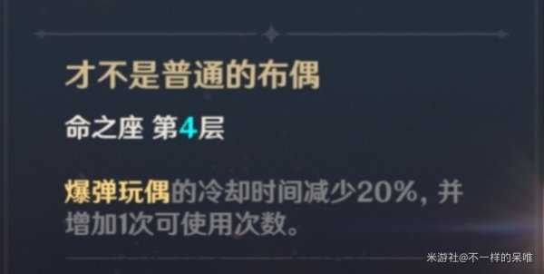 可以提供远程强火 兔兔的持续嘲讽提供相对安全输出环境以及快速破除冰盾 对命坐无任何要求唯一提升的就是六命 我实在是搞不懂为什么把一个辅助命座放到六命