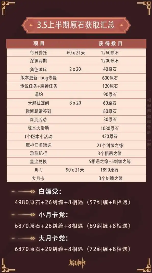 《原神》3.5版本即将更新,很多玩家想要了解新版本的原石能够获取多少,下面请看“祈鸢ya”带来的《原神》3.5版本原石数量汇总,希望能够帮助大家。