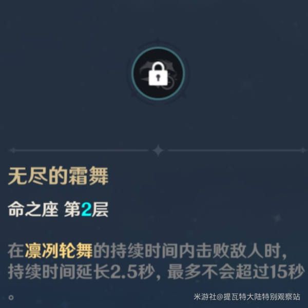 命座②无尽的霜舞:元素爆发持续期间击败敌人,冰棱持续时间会延长2.5秒,最多不超过15秒