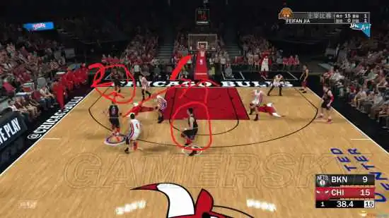 你在运球的时候时间长,队友就会拉开以及跑位,这里可以呼叫中锋向左侧挡拆。