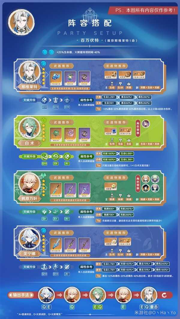 若想那维莱特全程都能享受到伤害加成,则推荐万叶的充能有180%+就可每次循环接上Q即可实现16s的伤害加成持续时间。