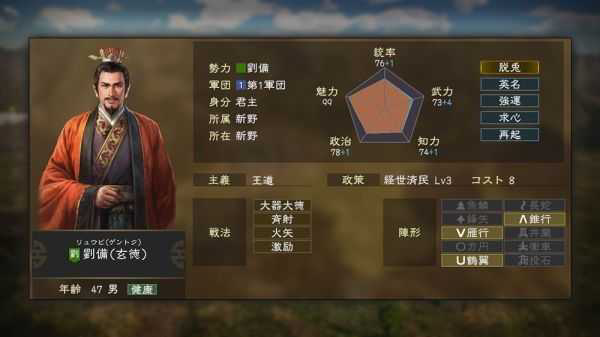 每位武将都有其【个性】,【个性】包含对战斗有利的个性、在内政中发挥效果的个性等共计150种以上。而更有其中一部分的武将拥有强力的固有【个性】,如在撤退中提高机动力的「脱兔」、战斗时即便数个敌方部队接近也不会受到包围效果影响的「斗将」等。