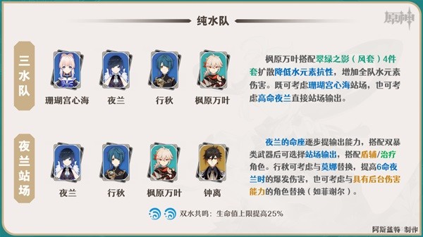 ①.三水队:行秋QEA、夜兰QE、心海EA、万叶QEA、心海Q后站场普攻
