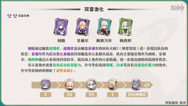 ②.因为纳西妲元素战技的协同攻击为中草元素附着,先手施放草神战技会出现万叶无法扩散雷元素的情况,所以可考虑先手扩散雷元素。