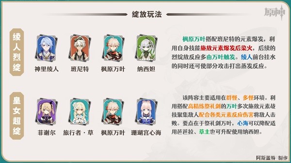 ①.绫人烈绽:纳西妲EQ、绫人Q、班尼特Q、万叶QE、绫人E接普攻输出