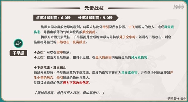 ②.点按战技产生3颗风元素微粒、长按战技产生4颗风元素微粒。产球阶段为腾空而起时的攻击,后续下落攻击(乱岚拨止)命中敌人不会产生风元素微粒。