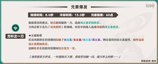 ①.施放元素爆发时的拔刀斩为强风元素,后续每2秒造成1次弱风元素攻击。