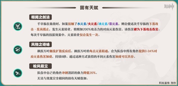 ①.普通攻击并不是枫原万叶的主要技能,主要在于施放元素战技后获得全新下落攻击模式,并配合固有天赋1(相闻之剑法)染色造成其他元素伤害。