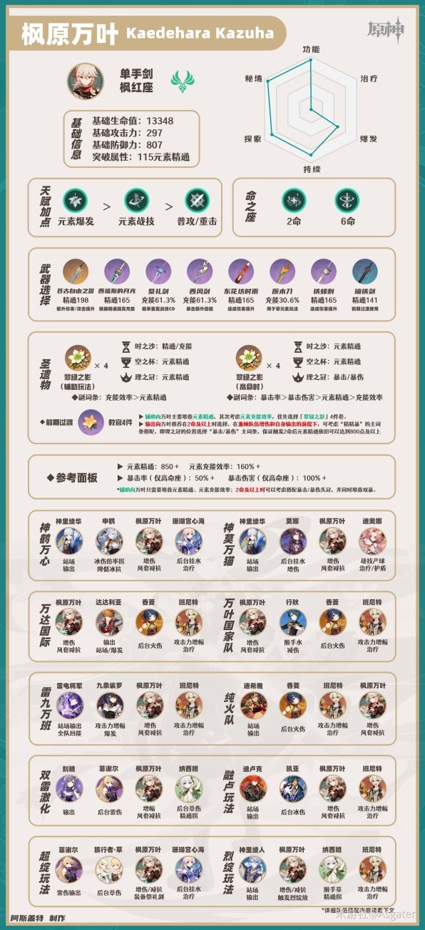 「枫原万叶」是一名通过技能触发扩散反应进而提高队伍对应元素伤害的风元素辅助型角色。他的战技具有牵引、聚集能力,元素爆发可以造成范围元素伤害。自枫原万叶登场至今,依旧处于强势角色前列,是当前角色中十分值得获得的角色之一。(角色培养一图流如下)