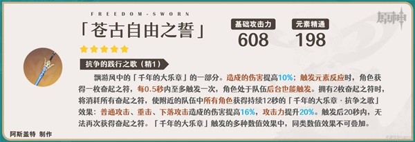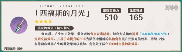 该武器通过转化万叶堆叠的元素精通进而提供额外元素充能效率,直接优化了万叶的充能效率堆叠,是当前辅助万叶优先考虑的武器。需要注意的是,砂糖/纳西妲提供的额外元素精通不能进一步提高充能效率。