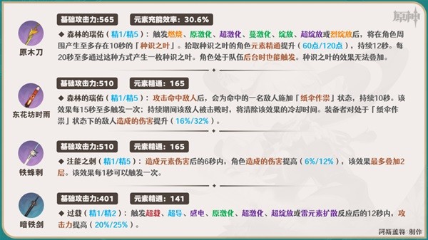 ①.原木刀:搭配草元素反应队伍时可考虑使用原木刀,优化技能循环的同时提供额外精通。