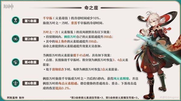 ②.2命获得的元素精通提升在元素爆发施放时便已经产生,此时固有天赋2(风物之诗咏)的增伤效果已经得到提升。该命座额外精通提升进一步提高了反应队的伤害,并且使万叶在后续高命时可考虑“精精暴”的培养方向。