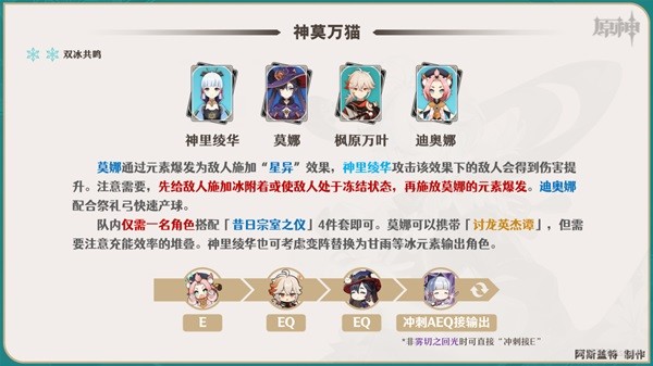 ②.当莫娜装备「讨龙英杰谭」时,其离场后需要直接切至神里绫华;神里绫华也可替换为其他冰元素输出角色,如甘雨、凯亚等。
