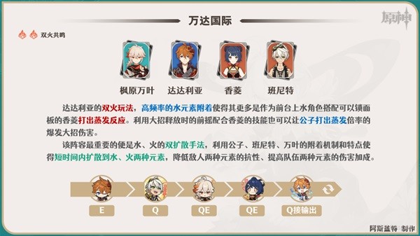 行秋施放技能附加弱水,班尼特施放元素爆发利用强火抵消行秋弱水、后接一次普攻触发行秋雨帘剑协同再次挂水,万叶施放元素爆发扩散敌人身上的水元素、后接战技染火后扩散火元素,完成水/火双扩散。