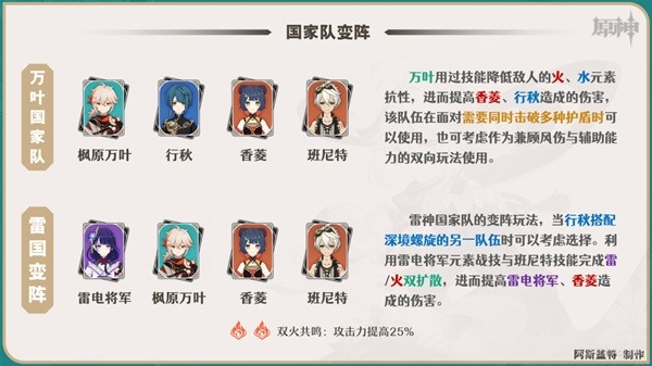 由万叶国家队阵容也可变阵为“宵行万班”、“卢行万班”,通过班尼特元素爆发施加附着的机制触发扩散提高站场火元素输出角色的伤害。