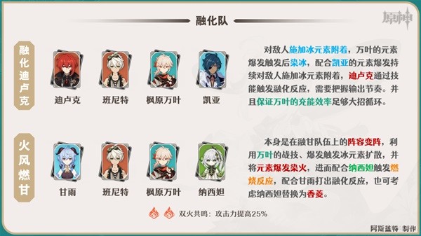 ①.融卢的染冰扩火(参考):凯亚施加强冰,后由万叶利用元素爆发触发冰扩散染冰,班尼特施放元素爆发、战技将敌人当前所附着的冰元素消耗掉,后由万叶战技染火扩火。