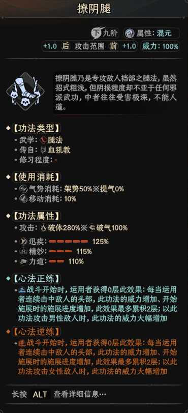 撩阴腿主要优势在于秒放和频率高,缺点是由于是九品基础伤害和命中都偏低,那么催破就需要点的更高,功法上命中更加优先于伤害,伏龙坛六品的龙闯阵,空桑八品的三部九侯这两个是要带到大结局的功法,命中加成真的很高。