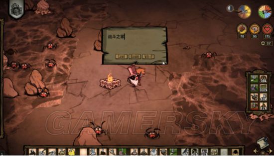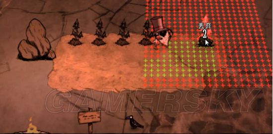 然后挖了几个地皮种树(矿区的地皮要铲掉才能种树,需要一本科技作出草叉)。蜘蛛人的安逸生活正式开始了。没错,蜘蛛人这个人物只需要吃蜘蛛肉,然后砍树烧火取暖就够了。不过要注意的是需要作出二本科技,来做出高礼帽,因为蜘蛛人的精神只有100点,少的可怜。