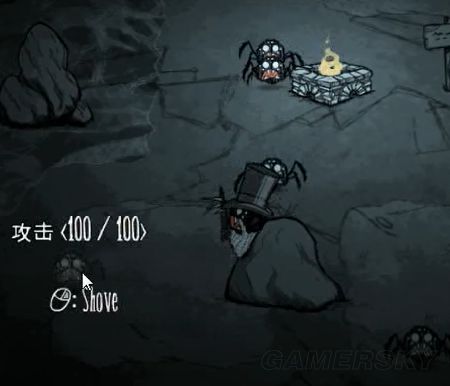 然后拿着武器,攻击一只没有被你雇佣的蜘蛛(其实打被自己雇佣的蜘蛛也可以),注意的是,千万别打下去,要打下去的瞬间马上按方向键让人物走开。