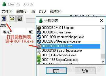 1. 运行游戏和修改器,在修改器界面电脑图标打开进程列表,选中ROTTR.exe进程,确定。