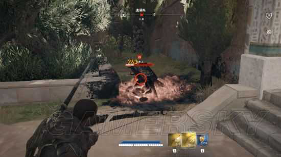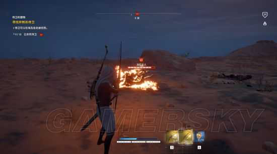 如图,你只需要两个技能:烟雾弹和火焰炸弹。看到侍卫第一时间下马靠近他,然后躲闪加烟雾击倒,第一时间补上火。侍卫有很大几率会像甲虫一样翻着肚子在火里滚来滚去什么也不做。站起来再补第二套循环就行了。