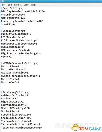 第四步,用记事本打开X(自己电脑 我的文档 所在硬盘):\Users\Eric\Documents\My Games\FINAL FANTASY XV\Steam\一串数字(不晓得是否因人而异)\savestorage内的GraphicsConfig.ini文件,在[NVIDIAGameWorksSettings]下加上NvidiaFlow=1以及NvidiaTerrainTesselation=1两行命令,在[RenderingSettings]下修改Antialias=1(这一步是在修改抗锯齿为FXAA,据说TXAA有显示上的问题,未测试),修改完成后内容如下图(请无视其他设定上的不同,均为画质上的设置):
