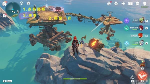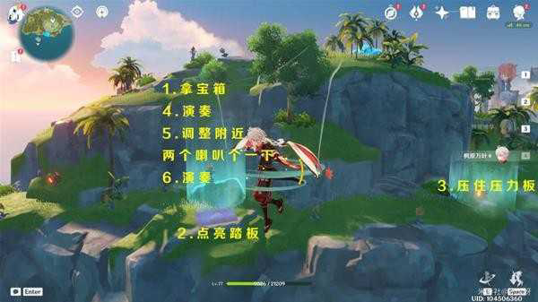 7.普通宝箱,限时挑战,先点亮踏板,激活演奏,再开启挑战,尽量跳到最高点再开风之翼,不要跳跃马上开翼,容易飞不高,拿不到高处的微粒