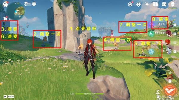 先跟随幻影三次,它会飞到地面,接着完成限时挑战,然后再到地面再次触碰幻影,它会变成宝箱,最后去改变山体,回来演奏