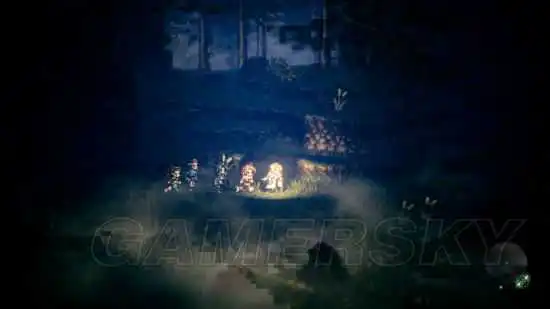 感觉应该像是水与油一样并不兼容的两种手法,实际上却为游戏画面营造出非常独特的气氛。比如说在森林迷宫当中,四周茂密的树木是以点阵图绘制,但包围玩家周边的浓雾则是使用 3D 图像描绘,充份表现出苍翠森林的阴暗,以及有一股寒气逼人的森林空气。另外像是在河边,以点阵图绘出的草丛,和用 3D 图像来表现出的流水与阳光反射,两者配合在一起,就让原本应该是抽象的风景,加上很真实的气氛以及空间的广度。这名为 HD-2D 的手法,特别是在使用 Nintendo Switch 主机的手提模式时,看起来会更加美丽,让人感觉到在自己两手之间,有一个以「可动童话故事书」为题的箱庭世界存在。