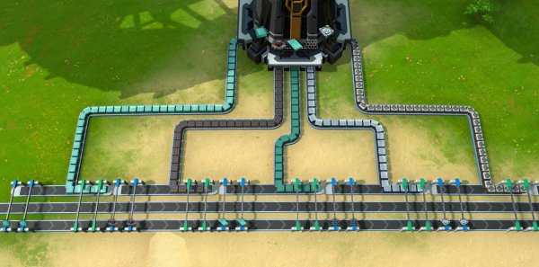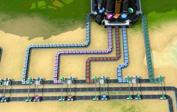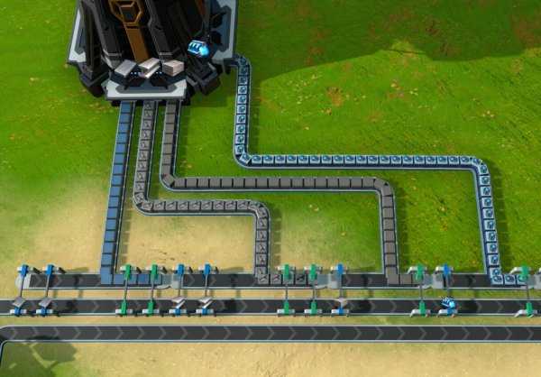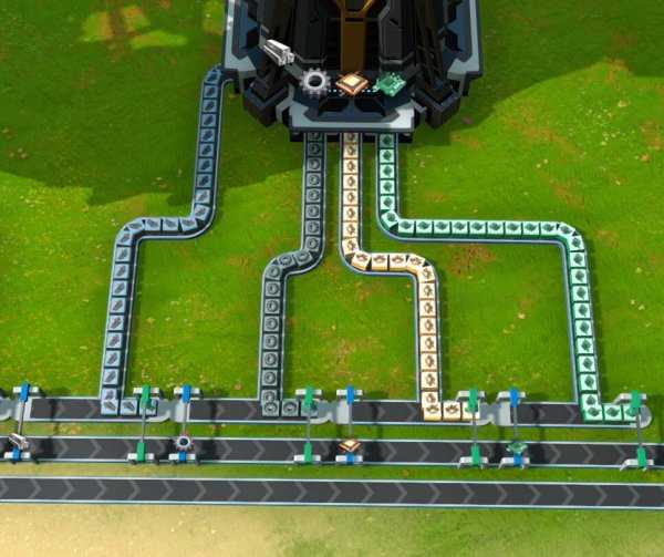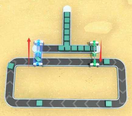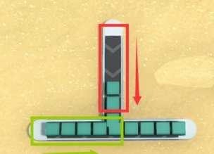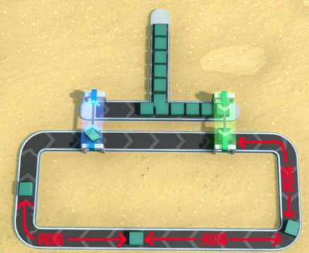 对于这种T字形的传送带,游戏中有一个被玩家称为“转弯让直行”的设定。只有当绿色框内的材料被用完并空出位置以后,红色框内的材料才会“落下来”汇入主线,否则红色框内的材料会一直被“顶住”,一动不动。