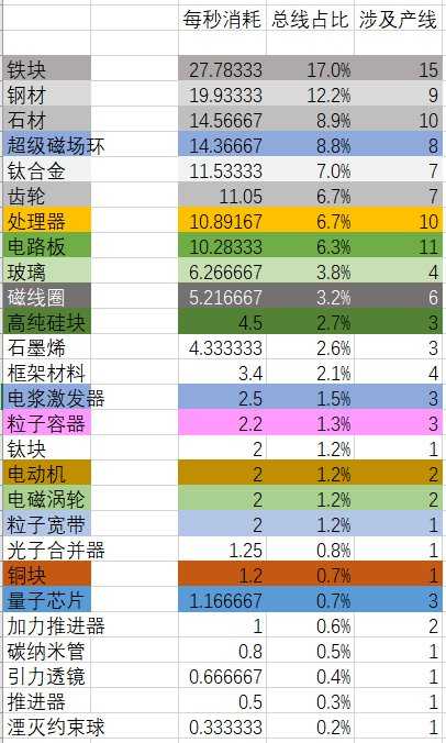 首先根据数据,我们可以清楚地看到在游戏中同时建造38种建筑和2种运输船的材料需求,以及每种材料的总线带宽占比、涉及的产线数量。