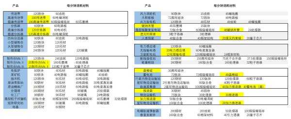 至于在什么位置摆放设备,这里就体现出混线生产的优越性了。由于所有原材料都在环带上运行,因此生产设备只要能连接到环带,放在哪里都可以!具体怎么放是很随便的,但是我稍微有点强迫症,就整理了一下所有产品的信息,如下图所示。(图里的数据就不用看了,我本来是想根据消耗量和优先级决定一下各种产品之间的上下游关系的,后来想想还是算了,太麻烦了也没必要。)大家可以参考一下我的分类方法,根据这些产品的类别决定哪些放在一起,靠近生产,这样也方便取货。 其中黄色格子的材料是需要就地生产的,黑框框起来的是原料有依赖关系的,最好相邻生产。