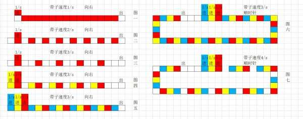 可以看到,每种材料的带宽占比只与其投放分拣器速度和传送带环带速度有关,是一个固定值,因此不用担心“某种材料的空间会被其他材料挤占”、“环带上材料会越来越多最终堵带”的问题。如果还不理解, 可以看看下面这张更加直观一点的图:
