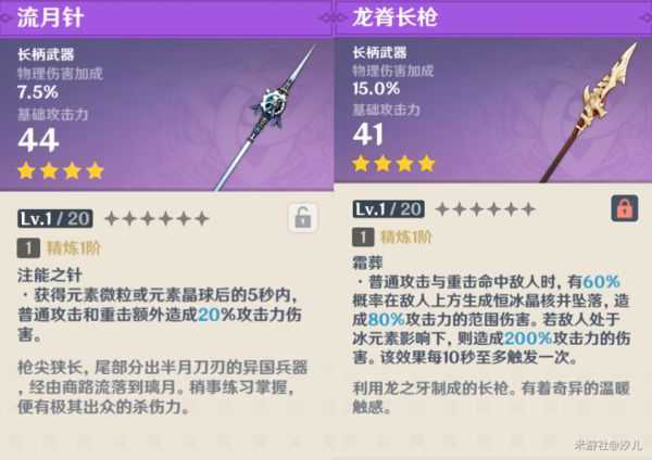 龙脊长枪属于雪山系列的锻造武器,它与其他几把雪山武器技能数据一模一样,因为上面大剑有提到,所以这里不再多赘述,我们直接来看流月针,当面对同一个敌人进行战斗时,流月针可以在战斗中获取20%的普攻与重击额外伤害增加,而龙脊长枪却是每10秒一次的特效触发伤害,从战斗持续方面来说,它不如流月针给的几乎等于常驻的伤害来的好看,所以从技能效果方面来说,是有些不如流月针。