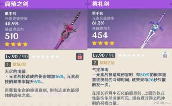 满级充能效率:腐殖之剑为45.9%,祭礼剑和西风剑为61.3%。