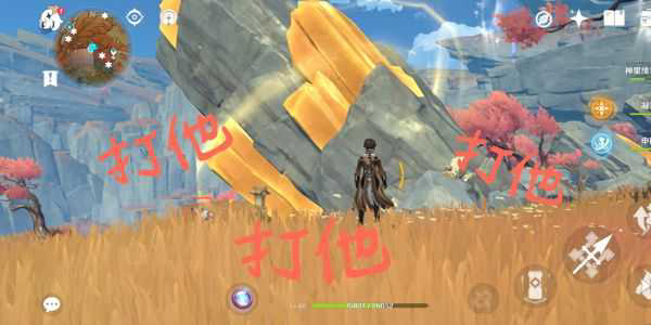 通过风场来到一根环绕着金光的大柱子面前,这里可以使用大剑角色在通过风场过来的时候直接使用下落攻击触发,也可以到达之后用大剑攻击他或者放一个岩造物,触发第一次冲击波后,我们需要一路放岩造物过去(如凝光的屏风,钟离的柱子,一斗的牛牛)冲击波碰到岩造物就会产生新的冲击波,最后把冲击波引导到奇怪的岩石前面,即可打开通道