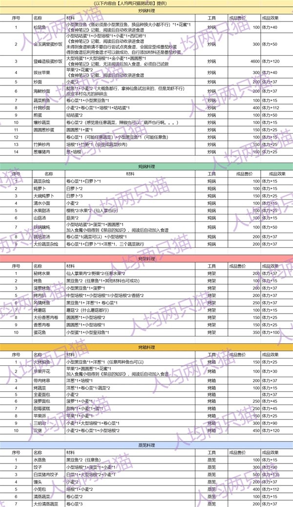 这边是我们赶出来的一部分比较简单【或者游戏内有配方的料理菜单】,提供给大家,大家可以参考一下。