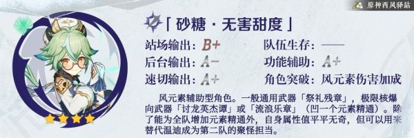 风元素辅助向法器角色。当前版本较少的额外增加元素精通的手段之一(其他手段大概有终末嗟叹之诗、教官套、阿贝多和满命迪奥娜),是增幅反应核爆队伍几乎必备的角色。「元素战技」与 「元素爆发」均有一定聚怪能力和较强的打断力,配合翠绿之影四件套,能在队伍中发挥较好的辅助作用。缺点是元素爆发需要80点能量,元素充能效率成为其辅助之路上的短板,笔者建议开启第一命之座后再考虑培养该角色。