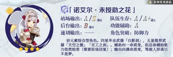 岩元素综合型大剑角色。无论输出向还是辅助向都较为依赖防御力的角色,在钟离/迪奥娜出来后,其作为护盾辅助的地位下降的较为厉害(元素战技CD过长)。平心而论,诺艾尔在平民新手的前期作为辅助过渡是较为不错的选择,但后期辅助能力显得后劲不足,在后期,她更多的是成为玩家口中的“人形高达”——六命后投入较多资源以成为开大持续输出高额岩元素伤害的存在,还未满命却有着培养诺艾尔意向的旅行者不要错过这次的池子~