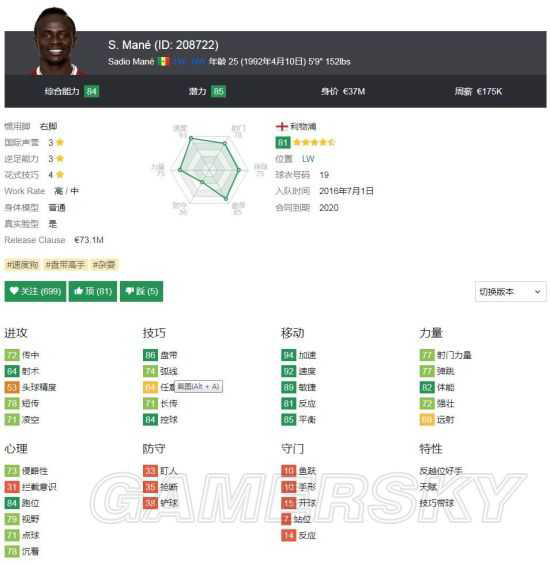 游戏中,马内是塞内加尔国家队能力最高的球员,总评达到了84,潜力为85.双速在92以上的他射术84,足以依靠飞快的速度突破防守球员后将球送入球门,尽管盘带控球并不算是马内的强项,但是高达89的敏捷还是让他在球场上异常的灵活,是一位手感非常不错的速度型边锋。